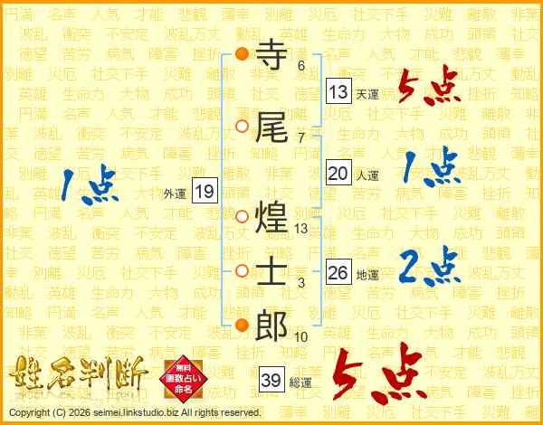 寺(6画)尾(7画) 煌(13画)士(3画)郎(10画)