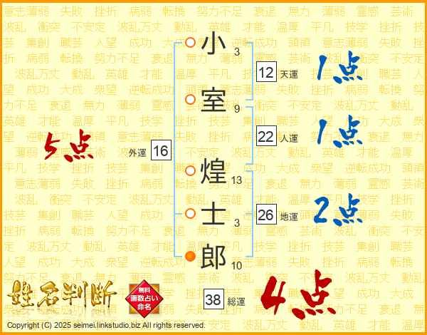 小(3画)室(9画) 煌(13画)士(3画)郎(10画)