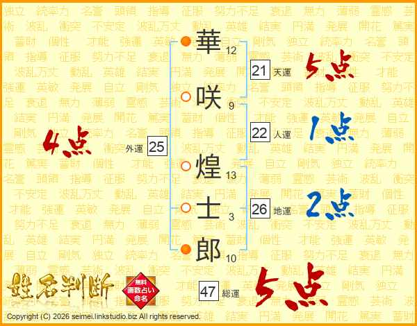 華(12画)咲(9画) 煌(13画)士(3画)郎(10画)