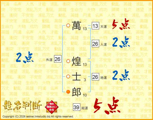 萬(13画) 煌(13画)士(3画)郎(10画)