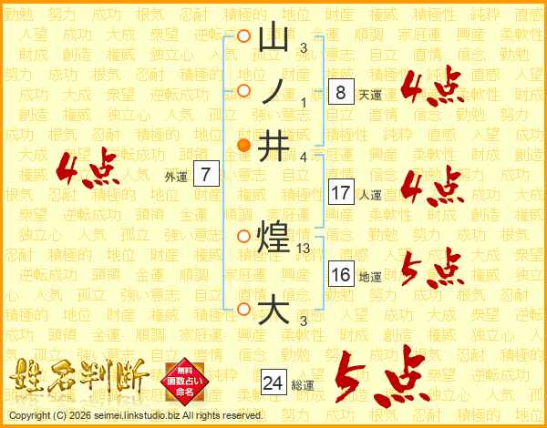 山ノ井煌大さんの総運は24画の5点!