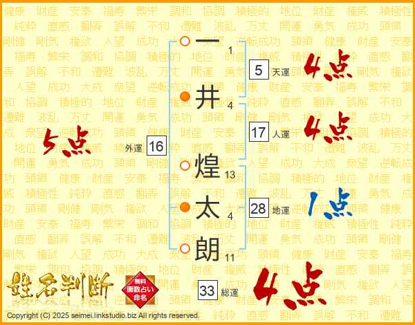 一(1画)井(4画) 煌(13画)太(4画)朗(11画)
