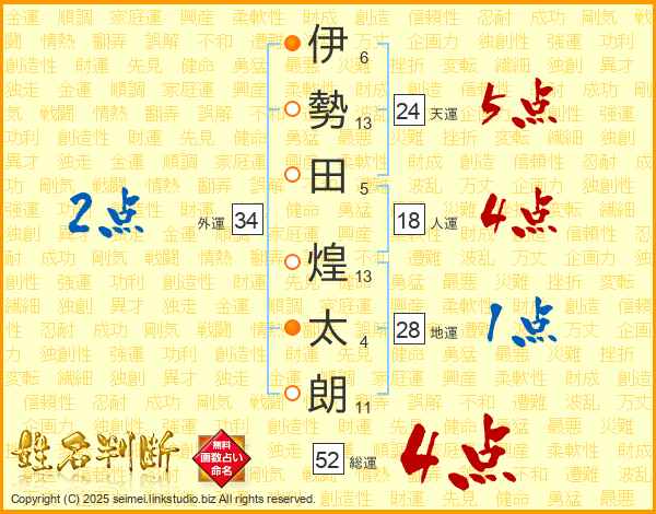 伊(6画)勢(13画)田(5画) 煌(13画)太(4画)朗(11画)