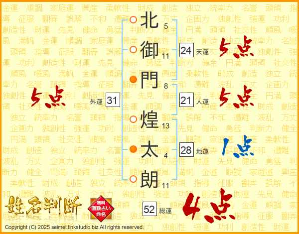 北(5画)御(11画)門(8画) 煌(13画)太(4画)朗(11画)