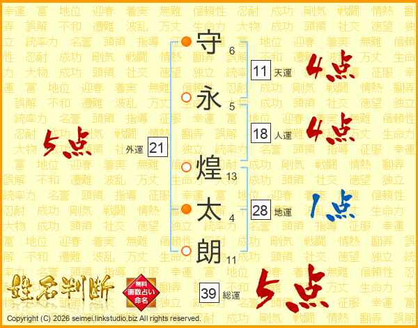 守(6画)永(5画) 煌(13画)太(4画)朗(11画)
