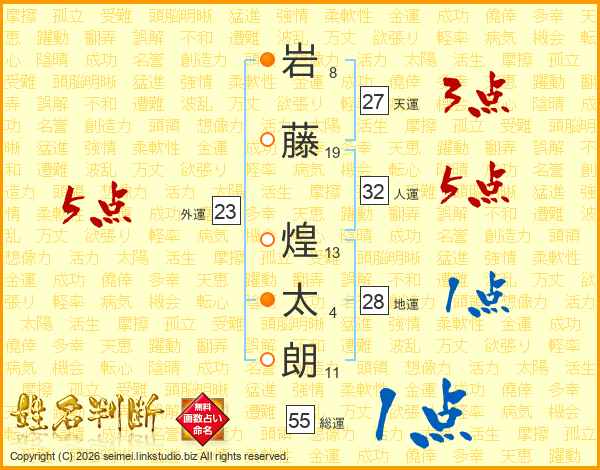 岩(8画)藤(19画) 煌(13画)太(4画)朗(11画)