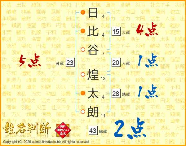 日(4画)比(4画)谷(7画) 煌(13画)太(4画)朗(11画)