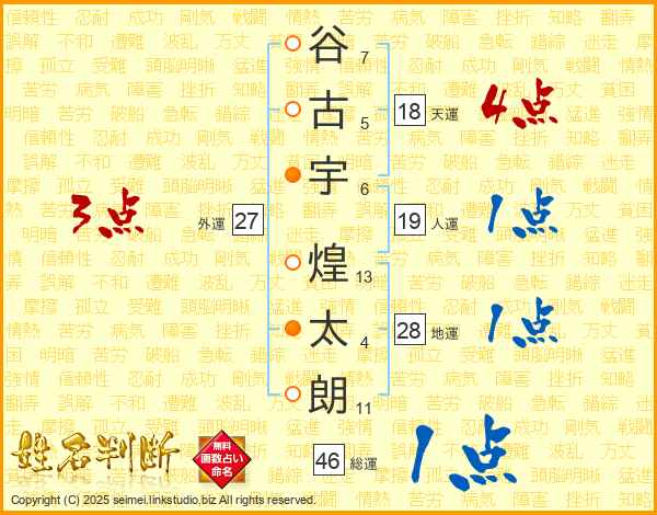 谷(7画)古(5画)宇(6画) 煌(13画)太(4画)朗(11画)