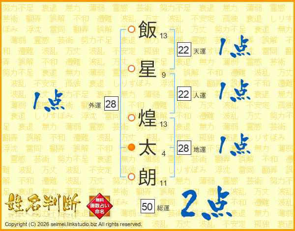 飯(13画)星(9画) 煌(13画)太(4画)朗(11画)