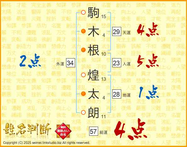 駒(15画)木(4画)根(10画) 煌(13画)太(4画)朗(11画)