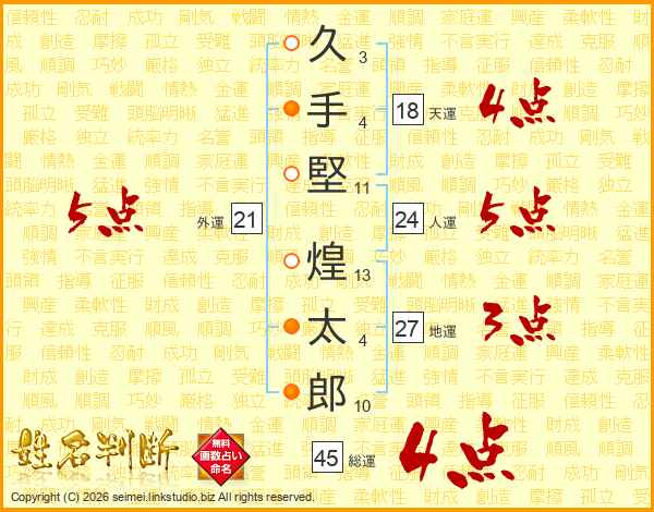 久(3画)手(4画)堅(11画) 煌(13画)太(4画)郎(10画)