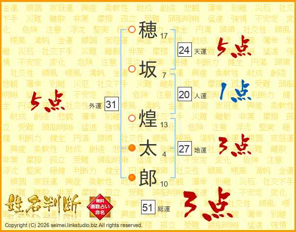 穂(17画)坂(7画) 煌(13画)太(4画)郎(10画)