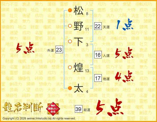 松(8画)野(11画)下(3画) 煌(13画)太(4画)