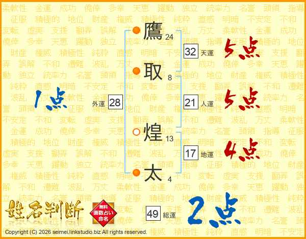 鷹(24画)取(8画) 煌(13画)太(4画)