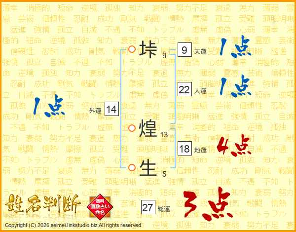 生活面を象徴する運勢です。外部から受ける影響力を表し、結婚運、家庭運や職場、環境への順応性を表します。総運から人運を引いた画数。姓や名が1文字の場合を除く。
