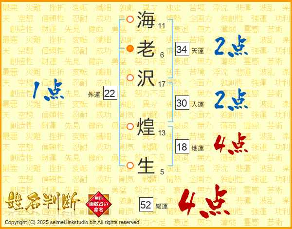 海(11画)老(6画)沢(17画) 煌(13画)生(5画)
