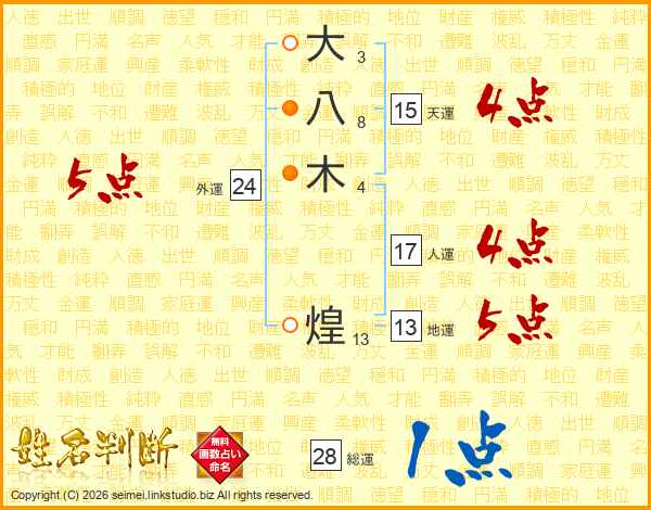 生活面を象徴する運勢です。外部から受ける影響力を表し、結婚運、家庭運や職場、環境への順応性を表します。総運から人運を引いた画数。姓や名が1文字の場合を除く。