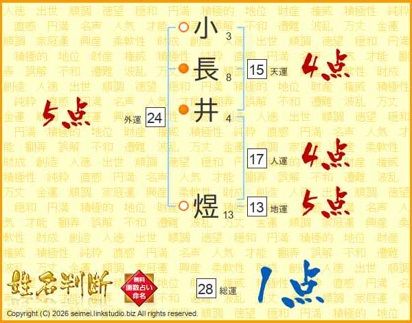 小(3画)長(8画)井(4画) 煜(13画)