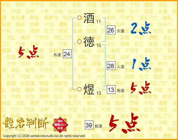 酒徳煜さんの総運は39画の5点!