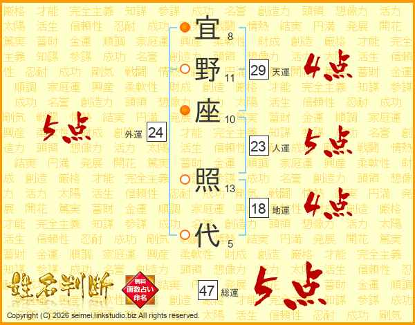 宜(8画)野(11画)座(10画) 照(13画)代(5画)