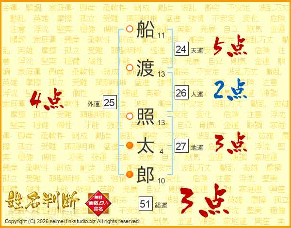 船(11画)渡(13画) 照(13画)太(4画)郎(10画)