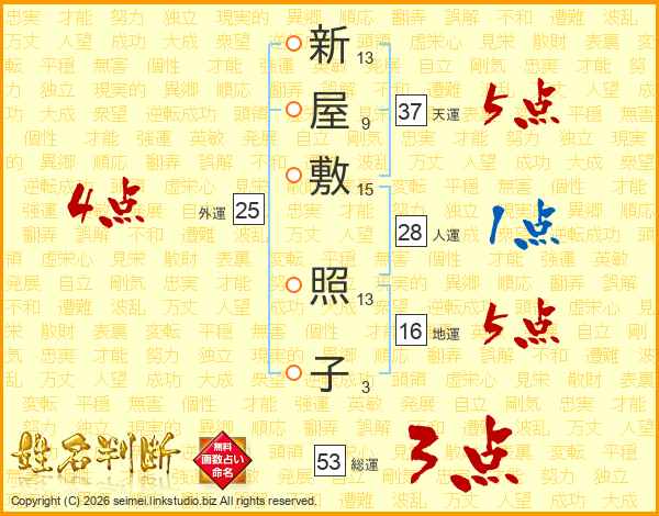新(13画)屋(9画)敷(15画) 照(13画)子(3画)