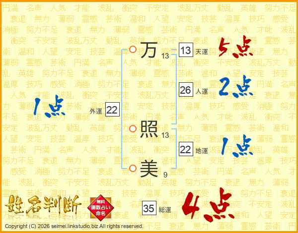 生活面を象徴する運勢です。外部から受ける影響力を表し、結婚運、家庭運や職場、環境への順応性を表します。総運から人運を引いた画数。姓や名が1文字の場合を除く。