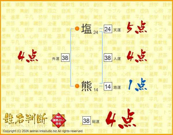 生活面を象徴する運勢です。外部から受ける影響力を表し、結婚運、家庭運や職場、環境への順応性を表します。総運から人運を引いた画数。姓や名が1文字の場合を除く。