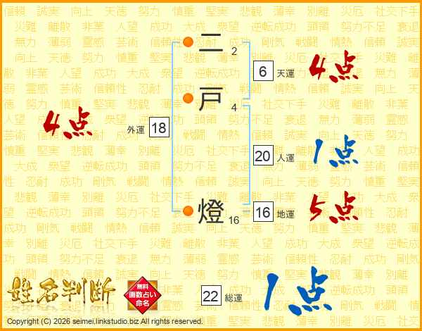 生活面を象徴する運勢です。外部から受ける影響力を表し、結婚運、家庭運や職場、環境への順応性を表します。総運から人運を引いた画数。姓や名が1文字の場合を除く。