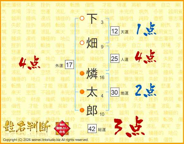 下畑燐太郎さんの人運は25画の4点!