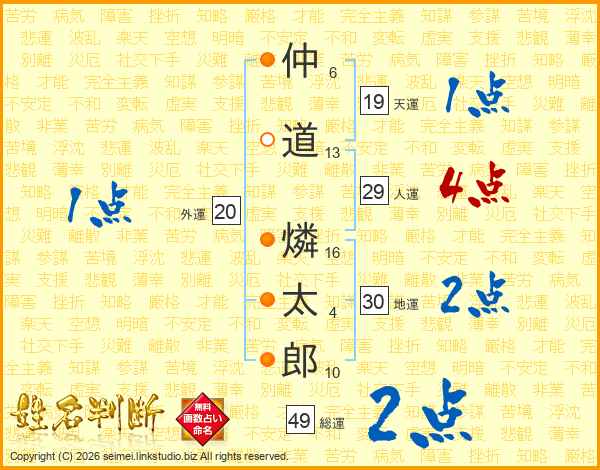仲(6画)道(13画) 燐(16画)太(4画)郎(10画)