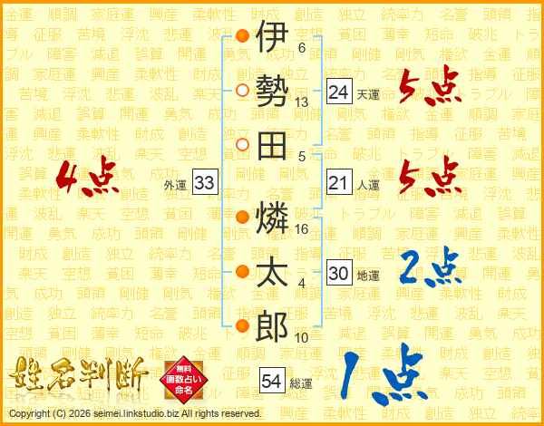 伊(6画)勢(13画)田(5画) 燐(16画)太(4画)郎(10画)