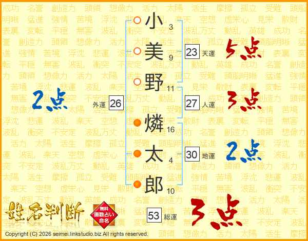 小(3画)美(9画)野(11画) 燐(16画)太(4画)郎(10画)