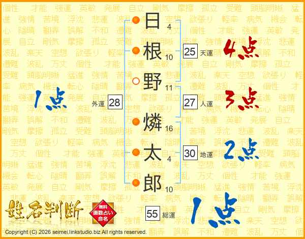 日(4画)根(10画)野(11画) 燐(16画)太(4画)郎(10画)