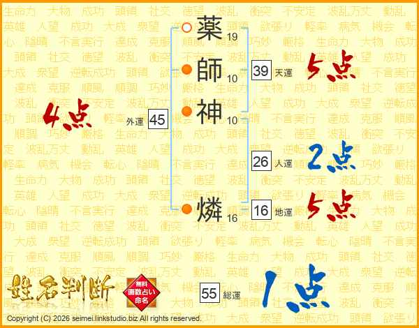 生活面を象徴する運勢です。外部から受ける影響力を表し、結婚運、家庭運や職場、環境への順応性を表します。総運から人運を引いた画数。姓や名が1文字の場合を除く。