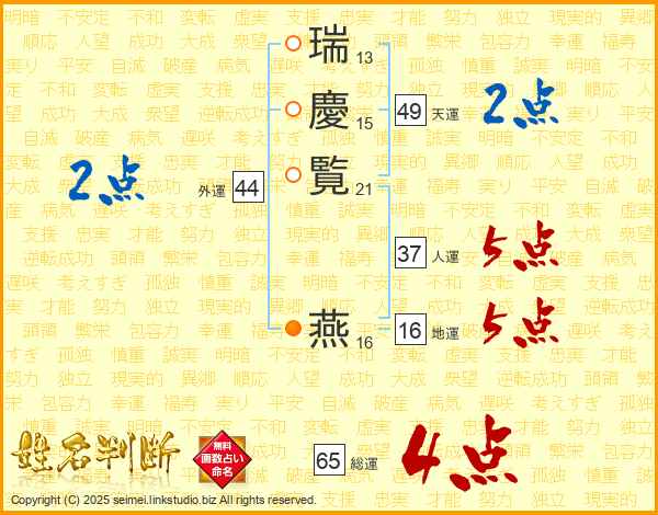 瑞(13画)慶(15画)覧(21画) 燕(16画)