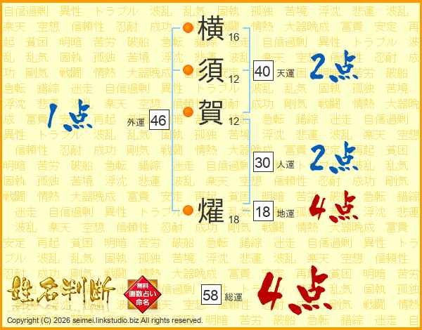 生活面を象徴する運勢です。外部から受ける影響力を表し、結婚運、家庭運や職場、環境への順応性を表します。総運から人運を引いた画数。姓や名が1文字の場合を除く。