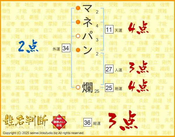 マ(2画)ネ(4画)パ(3画)ン(2画) 爛(25画)