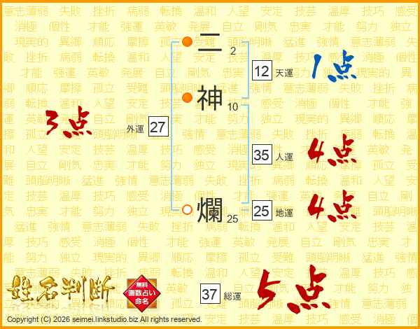 生活面を象徴する運勢です。外部から受ける影響力を表し、結婚運、家庭運や職場、環境への順応性を表します。総運から人運を引いた画数。姓や名が1文字の場合を除く。