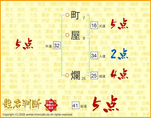 町(7画)屋(9画) 爛(25画)