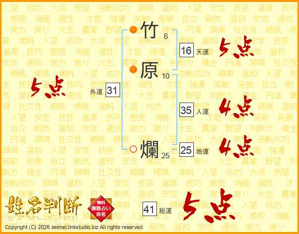 竹原爛さんの総運は41画の5点!