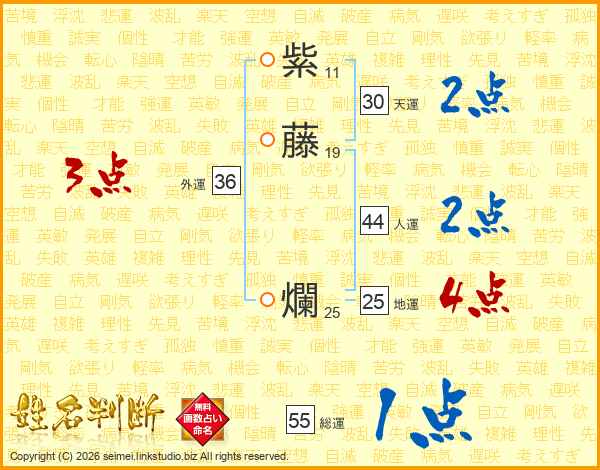あなたの人生を表す1番重要な運勢です。生涯を通じて影響する総合運となり、主に50歳以降の晩年期に影響を及ぼします。苗字と名前の合計画数。