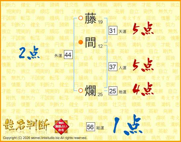 生活面を象徴する運勢です。外部から受ける影響力を表し、結婚運、家庭運や職場、環境への順応性を表します。総運から人運を引いた画数。姓や名が1文字の場合を除く。