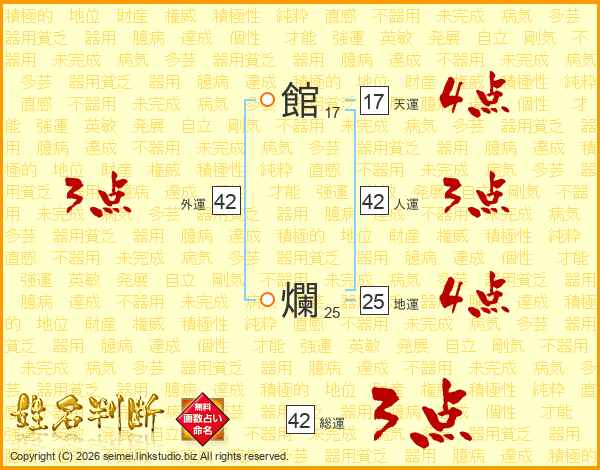 生活面を象徴する運勢です。外部から受ける影響力を表し、結婚運、家庭運や職場、環境への順応性を表します。総運から人運を引いた画数。姓や名が1文字の場合を除く。
