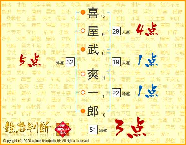 喜(12画)屋(9画)武(8画) 爽(11画)一(1画)郎(10画)