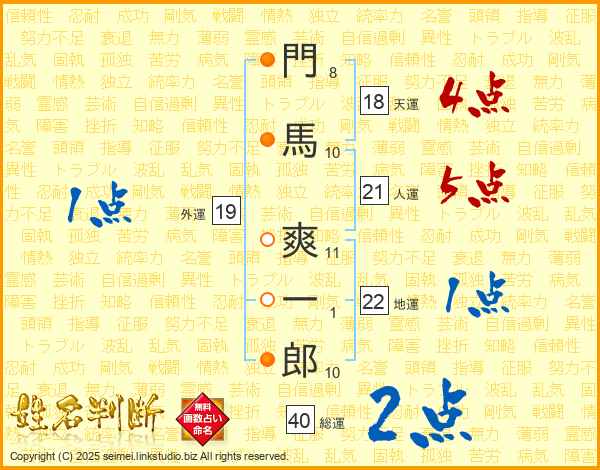 門(8画)馬(10画) 爽(11画)一(1画)郎(10画)
