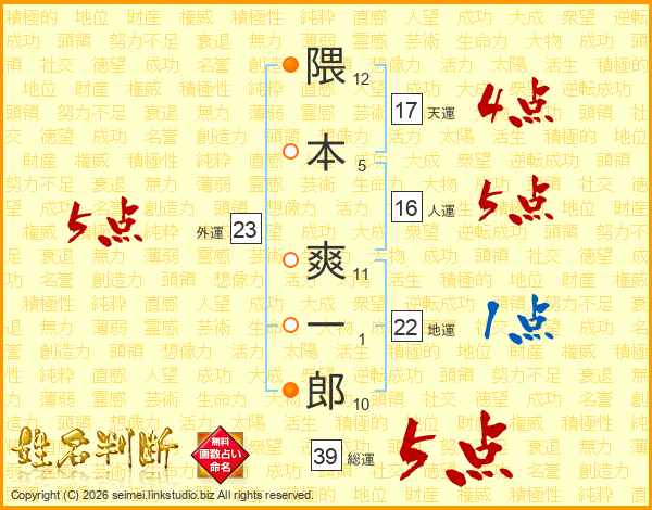 隈(12画)本(5画) 爽(11画)一(1画)郎(10画)