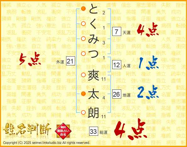 と(2画)く(1画)み(3画)つ(1画) 爽(11画)太(4画)朗(11画)