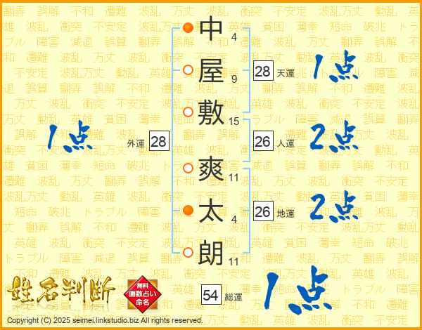 中(4画)屋(9画)敷(15画) 爽(11画)太(4画)朗(11画)