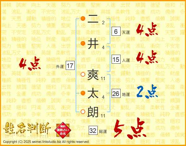 二(2画)井(4画) 爽(11画)太(4画)朗(11画)